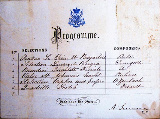 Programme of music to be performed by the band of the 9th Lancers, led by their Bandmaster, Frederick Albert Seume